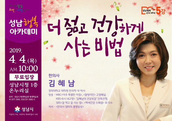 성남시(시장 은수미)는 4월 4일 오전 10시 성남시청 온누리에서 김혜남 한의사를 초빙 ‘더 젊고 건강하게 사는 법’을 주제로 올 해 다섯 번째 성남행복아카데미 강연을 연다.