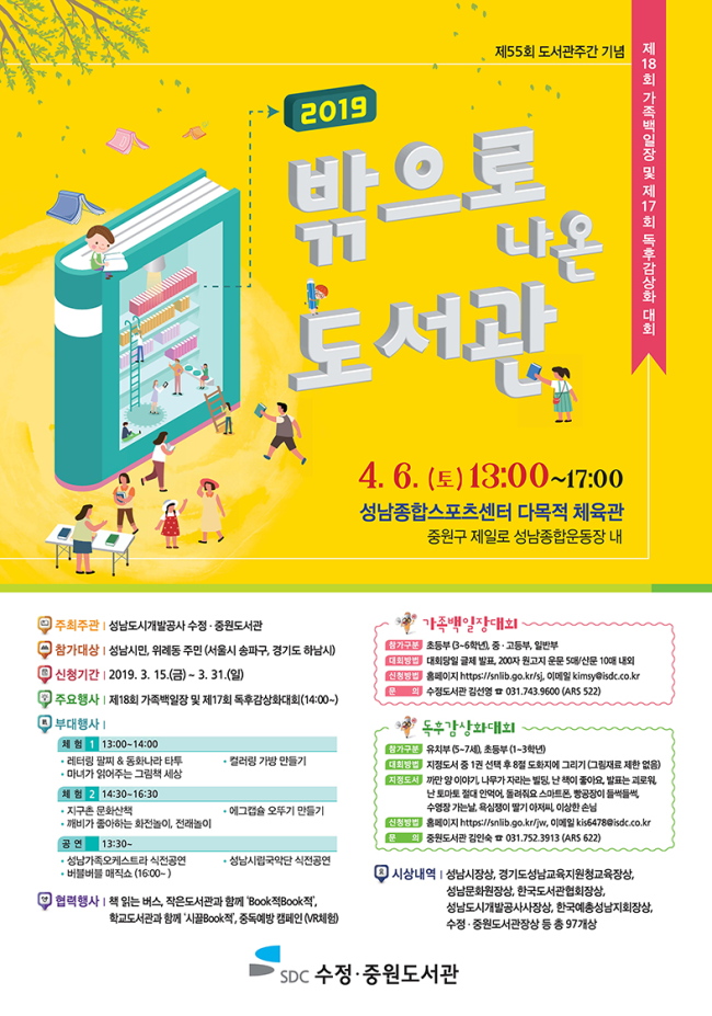 성남도시개발공사(사장 윤정수)에서 운영하는 수정․중원도서관은 매년 4월 도서관 주간을 맞아 개최하던 ‘가족백일장 및 독후감상화 대회’를, 올해부터 2019 『밖으로 나온 도서관』으로 명칭을 변경하여 오는 6일(토) 13시 성남스포츠센터에서 책을 사랑하는 성남시민들과 함께 할 준비를 하고 있다.