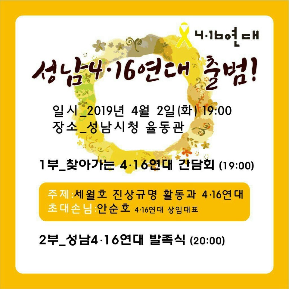 성남416연대(준)는 4월 2일 오후 7시 성남시청 율동관서 '성남4.16연대' 발족식을 갖고 그 동안의 활동보고와 평가, 향후 활동을 공유한다.