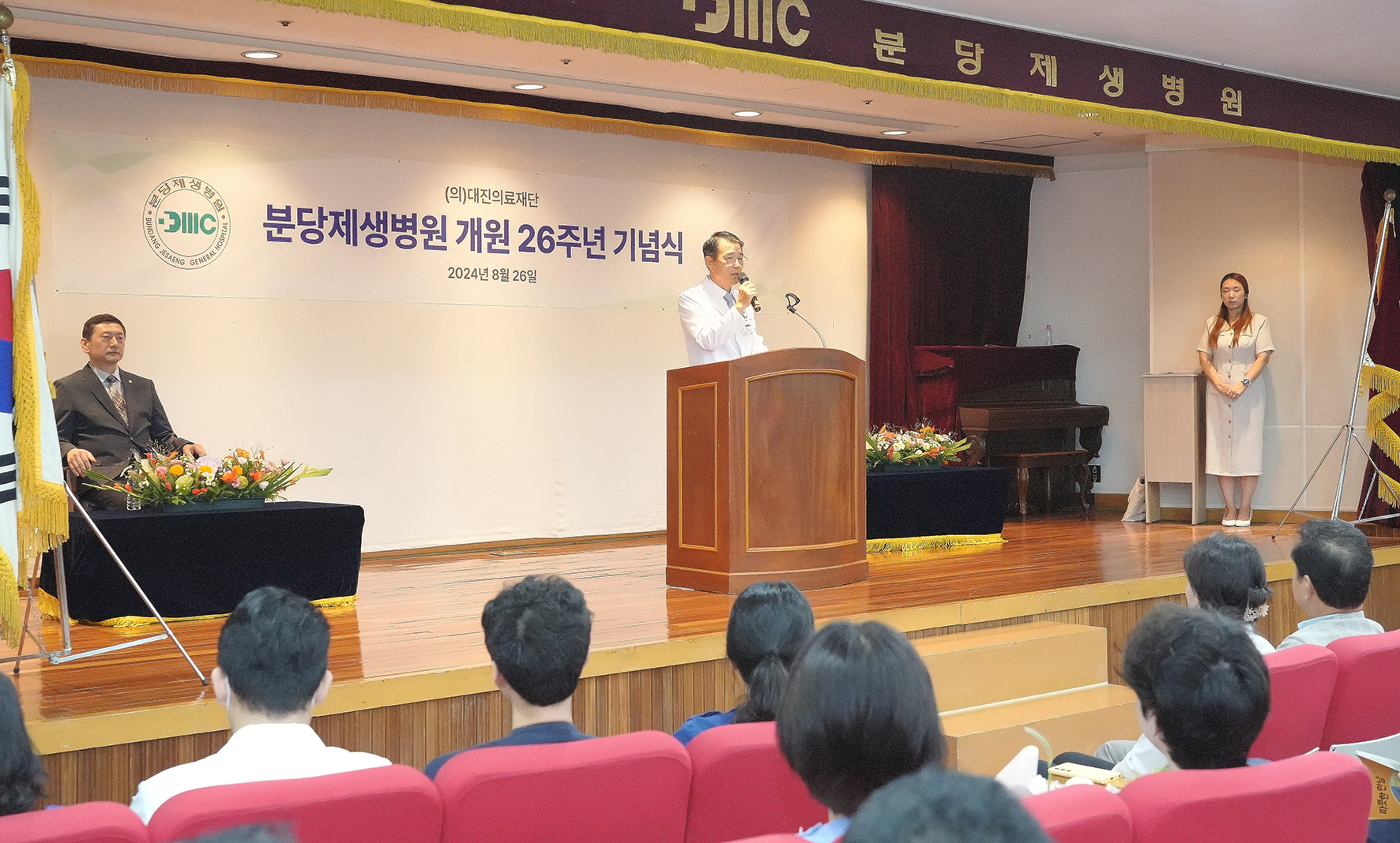 대진의료재단 분당제생병원(병원장 나화엽)이 8월 26일 개원 26주년을 맞이하여 개원 기념식을 가졌다고 밝혔다. 나화엽 병원장은 “병원이 의정 갈등으로 진료에 어려움을 겪고 있지만, 올해 초부터는 중환자실 전담 전문의가 4명으로 늘어, 치료 역량이 크게 향상되었다.”며 “건강보험심사평가원 등 외부 기관의 좋은 평가와 중환자실 인력 확충은 우리 병원이 환자를 잘 치료할 수 있는 역량을 공인해 주는 지표이므로 임직원은 큰 자부심을 가져도 되겠다.”고 말했다.