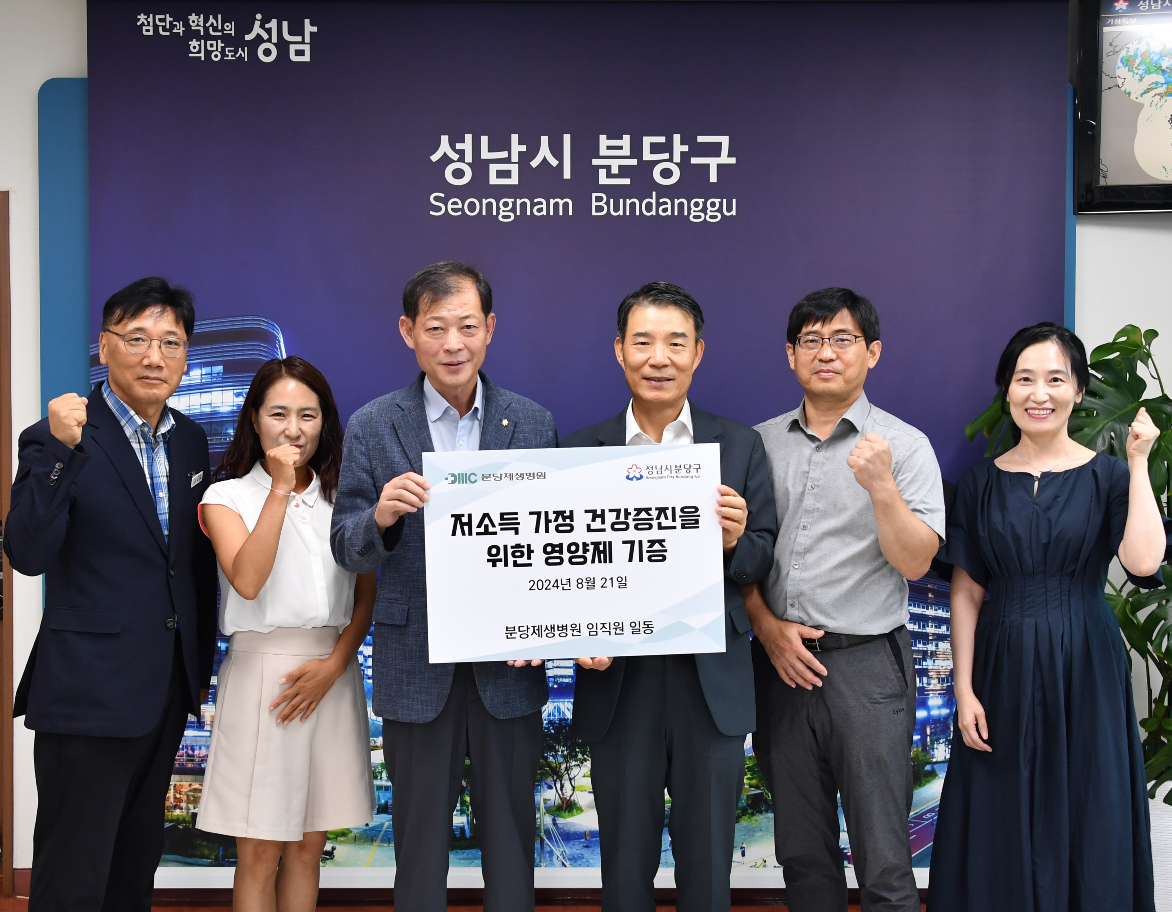 한편, 나화엽 병원장은 지난 21일 분당구청을 방문하여 취약 가정을 위한 영양제 200명분을 기탁했다. 이 행사는 지속적인 지역사회 보건 증진 활동에 대한 책임을 다하기 위한 취지로 진행되었다. 기탁 물품은 병원 직원들이 기부한 월급 자투리로 조성된 기금으로 마련된 것이다. 신정주 분당구청장은 “분당제생병원의 개원 26주년을 축하하며, 다수의 병원이 운영에 어려움이 있다 들었는데 어려운 여건 속에서도 지속적으로 분당구 주민의 건강에 관심을 두고 나눔을 실천해 주신 병원 관계자분들께 감사드리며, 영양제뿐만 아니라 따뜻한 마음도 함께 전달하겠다.”고 전했다.