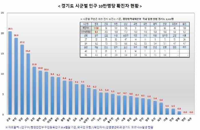 경기도에선 그동안 23명의 감염자가 사망해 2.04%의 치명률을 기록했다. 같은 기간 전국적으로 280명이 사망했고 치명률은 2.24%로 비슷하다.
