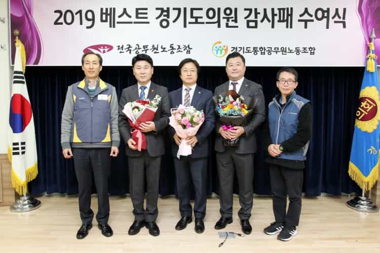 이번 수여식은 전국공무원노조 경기도청지부(지부장 윤석희)와 경기도통합공무원노조(위원장 백승진) 공동 주관 ‘2019 베스트 경기도의원’에 선정된 3명(김원기, 배수문, 김봉균)의 도의원에 대한 감사패 수여 행사로 양대 노조위원장과 직원들의 축하가 함께 이어져 연말 뜻깊은 자리가 되었다.