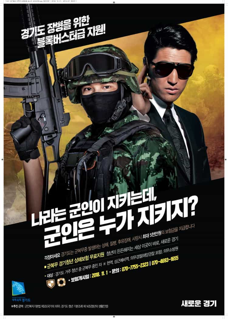 경기도가 2018년 11월부터 전국 최초로 시행하고 있는 ‘군복무 경기청년 상해보험 지원사업’은 경기도에 거주하는 군복무 청년이라면 별도 가입 절차 없이 군복무 시작과 동시에 상해보험에 자동 가입되고, 전역 때까지 자동 연장된다.