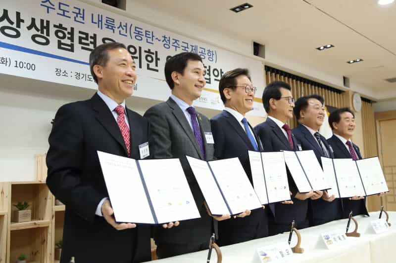 이재명 경기도지사와 이시종 충청북도지사, 서철모 화성시장, 한범덕 청주시장, 송기섭 진천군수, 최문환 안성시장 권한대행 등 6개 지자체장은 19일 경기도청에서 이 같은 내용을 담은 ‘수도권 내륙선(동탄~청주국제공항) 상생협력을 위한 업무협약서’에 공동 서명했다.