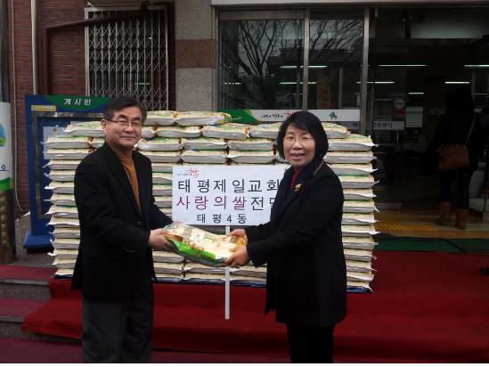 태평4동 태평제일교회(담임목사 성낙운)에서는 2013년 1월 22일 관내 어려운 이웃을 위하여 태평4동 주민센터에 백미 10kg 100포를 기탁하였다.