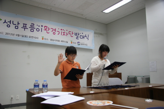 성남환경운동연합 활동 소개와 푸름이 환경기자단 교육 활동 영상 상영이 이어졌으며, 기자단을 대표해서 김현민 편집장과 송원택 부편집장이 푸름이환경기자단 선언을 했다.