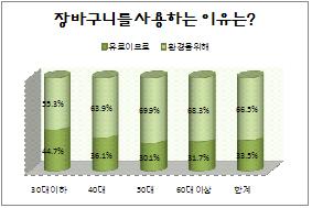 장바구니를 사용하지 않는 이유에 대해 귀찮아서라는 응답이 50.4%였고, 장바구니가 없어서라는 응답이 49.6%였다. 귀찮아서라는 응답은 30대 이하에서 65.6%로 특히 높았다.