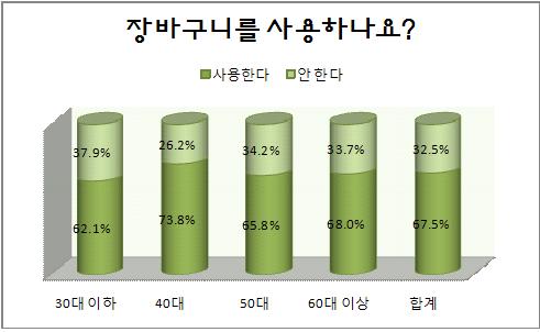 장바구니를 사용하고 하는 지에 대한 질문에 대해 67.5%는 사용하고 있다고 응답했고, 32.5%는 사용하고 있지 않다고 응답했다. 30대 이하 연령층의 장바구니 사용률이 62.1%로 가장 낮았으며, 40대가 73.8%로 가장 높게 나타났다.