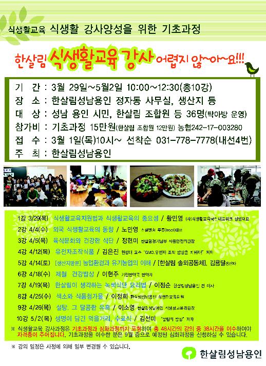 한살림 식생활교육 강사 양성교육 페이지 정보 작성자 작성일 12-03-06 23:17 본문 김영철 chul520@hanmail.net 목록 이전글성남시 사회복지담당공무원 저소득가정 장학금 전달 12.03.11 다음글성남시 여성문화회관, 450명 수강생 자기개발 시작 12.02.28