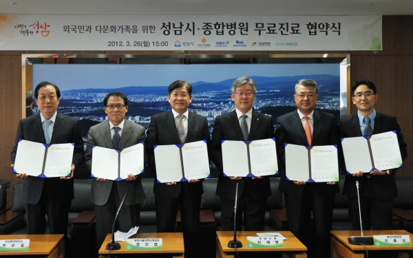 성남시는 26일 오후 3시 시청 상황실에서 보바스기념병원, 분당서울대학교병원, 분당차병원, 성남중앙병원, 정병원과 ‘외국인·다문화가족 무료 진료’를 위한 업무협약을 했다.
