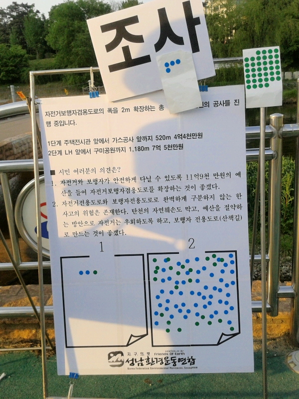 지난 4월 23일 성남환경운동연합(공동의장 주혜 ․ 백찬홍)의 ‘탄천자전거도로 정비사업 재검토 하라!’ 는 논평에 대해 성남시(시장 이재명)는 정자동 주택전시관~가스공사까지 구간의 도로를 보행자와 자전거이용자가 혼용하고 있어 분리설치가 불가피하다고 주장을 펼치고 있다.