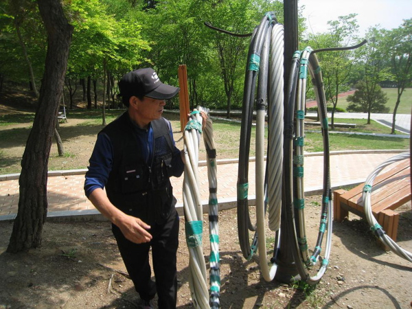 보름에 한번 씩 등산과 산책을 하며 행여나 고장 난 훌라후프로 지역주민이 다치지 않을까 하나하나 꼼꼼히 점검하며 수리한다.