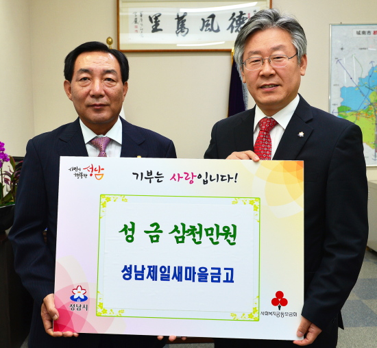성남제일새마을금고(이사장 정광옥)는 31일 오전 10시 성남시에 불우이웃돕기 성금으로 3천만원을 기탁했다.