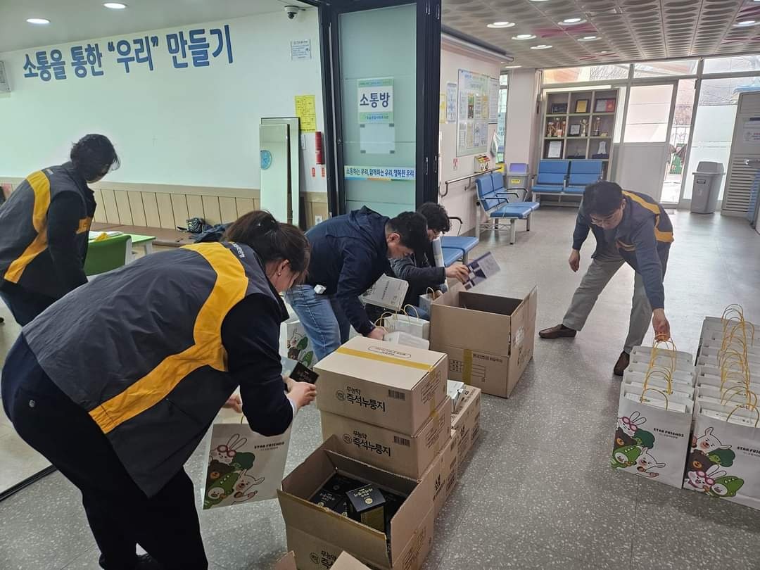 <국민은행 경기4PG 사랑나눔봉사단은 지역 내 사각지대 어르신 가정에 누룽지세트와 생필품 키트 등 후원물품을 전달했다.>