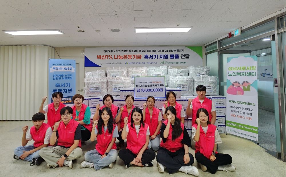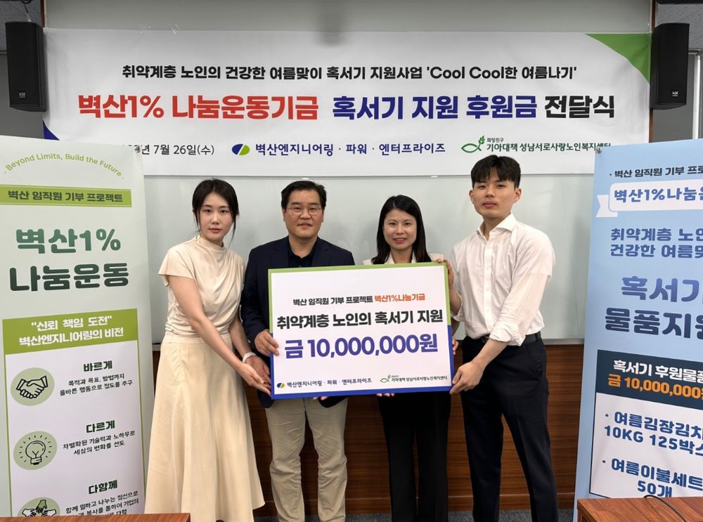 벽산엔지니어링‧파워‧엔터프라이즈(회장 김희근)는 26일 저소득 취약계층 노인의 여름철 폭염 대비를 위한 혹서기 물품 지원을 위해 후원금 1,000만 원을 성남서로사랑노인복지센터에 기탁했다.