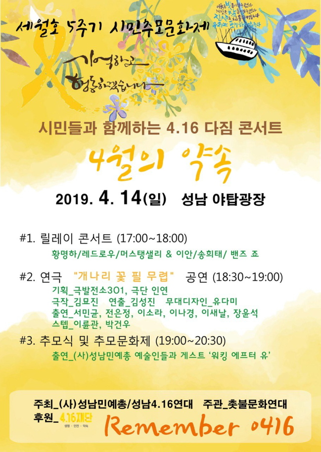 한편, 4월 12일(금)~16일(화) 야탑광장에서 시민분향소를 운영하며, 14일(일) 오후 1시부터 청소년 추모문화제, 오후 3시부터 시민추모공연(버스킹), 종교단체 합동추모기도회, 추모식 등을 저녁까지 이어간다.
