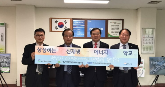 성남환경운동연합(공동의장 김상렬)은 4월 5일(수) 오후 2시 30분 분당구청에서 성남시민햇빛발전사회적협동조합 백찬홍 이사장, 한국남동발전 분당발전본부 김학빈 본부장과 분당구 윤기천 구청장이 참여한 가운데, 성남시 초‧중‧고등학생에게 신재생에너지교육 '상상하는 신재생에너지 학교' 진행 협력을 위한 4개 기관 간의 협약을 체결했다.