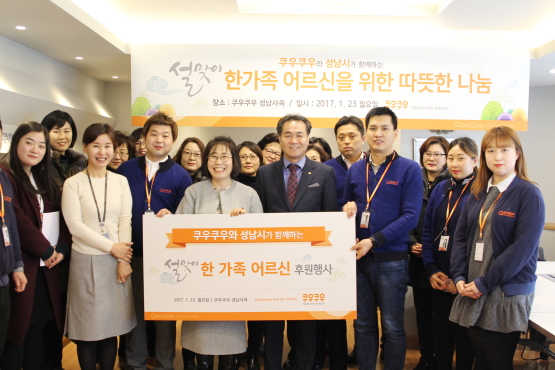 ㈜쿠우쿠우(회장 김영기)는 설연휴를 맞아 수정구 관내 수진1동·수진2동 어려운 생활환경의 독거어르신이 따뜻한 겨울을 보낼 수 있도록 1월 23일 떡국 떡 및 생활용품 149박스(550만원 상당)을 후원했다.