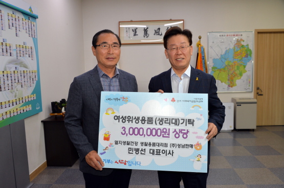 같은 날 중원구 하대원동에서 LG생활건강 생활용품 대리점을 하고 있는 민병선 대표도 1만 2천개 분량의 생리대 100 박스를 어려운 여성 청소년들에게 전해달라며 성남시에 기탁했다.