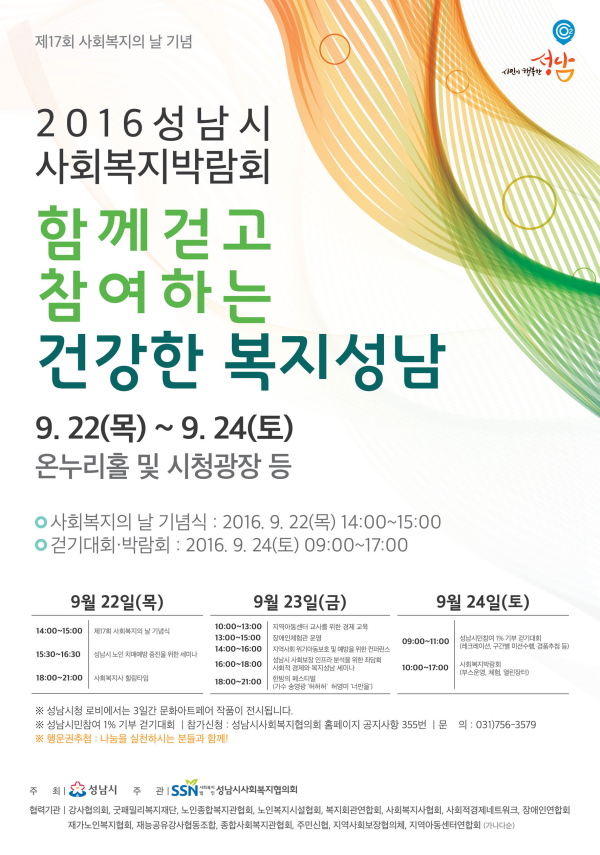 행사 첫날인 9월 22일 오후 2시 성남시청 온누리에서 ‘사회복지의 날 기념식’이 열린다.