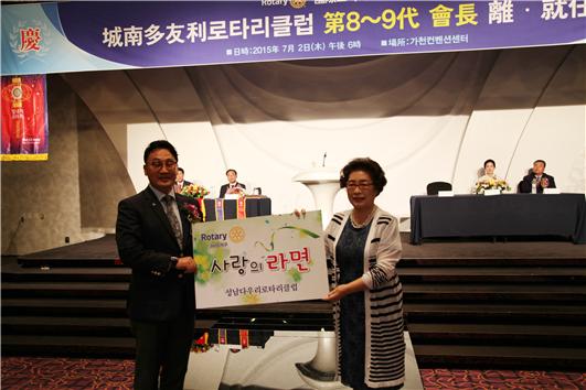최맹석 회장은 지인들의 축하 화환을 라면과 쌀로 기부 받아 (사)다음누리와 (사)청목회에 각 각 라면 100박스와 20kg 쌀160포를 기증하며 '세상에 선물이 되자' 라는 2015-16년 목표를 취임과 함께 이행하는 모습에 주위의 많은 사람들에게 훈훈한 모습을 전하였다.