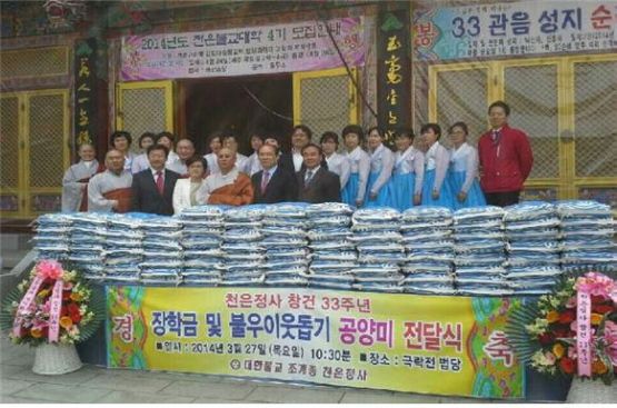 분당구 새마을로 112(서현1동)에 위치한 천은정사(주지 현우스님)에서 창건 33주년을 기념하여 열리는 기념법회에서 관내 불우이웃 및 학생들에게 백미와 장학금을 3월 27일 전달했다.