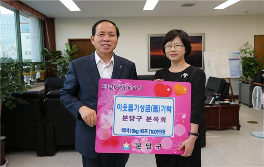 성남시 분당구 기관장들의 친목모임인 분목회(회장 분당구청장 한신수)는 2013년 중추절을 맞이하여 분당구 지역에 도움을 필요로 하는 이웃에게 따뜻한 사랑에 마음을 전달하고자 2013. 09.17(화) 백미10kg 40포(환가액 100만원)를 주민생활지원과장에게 전달하였다.
