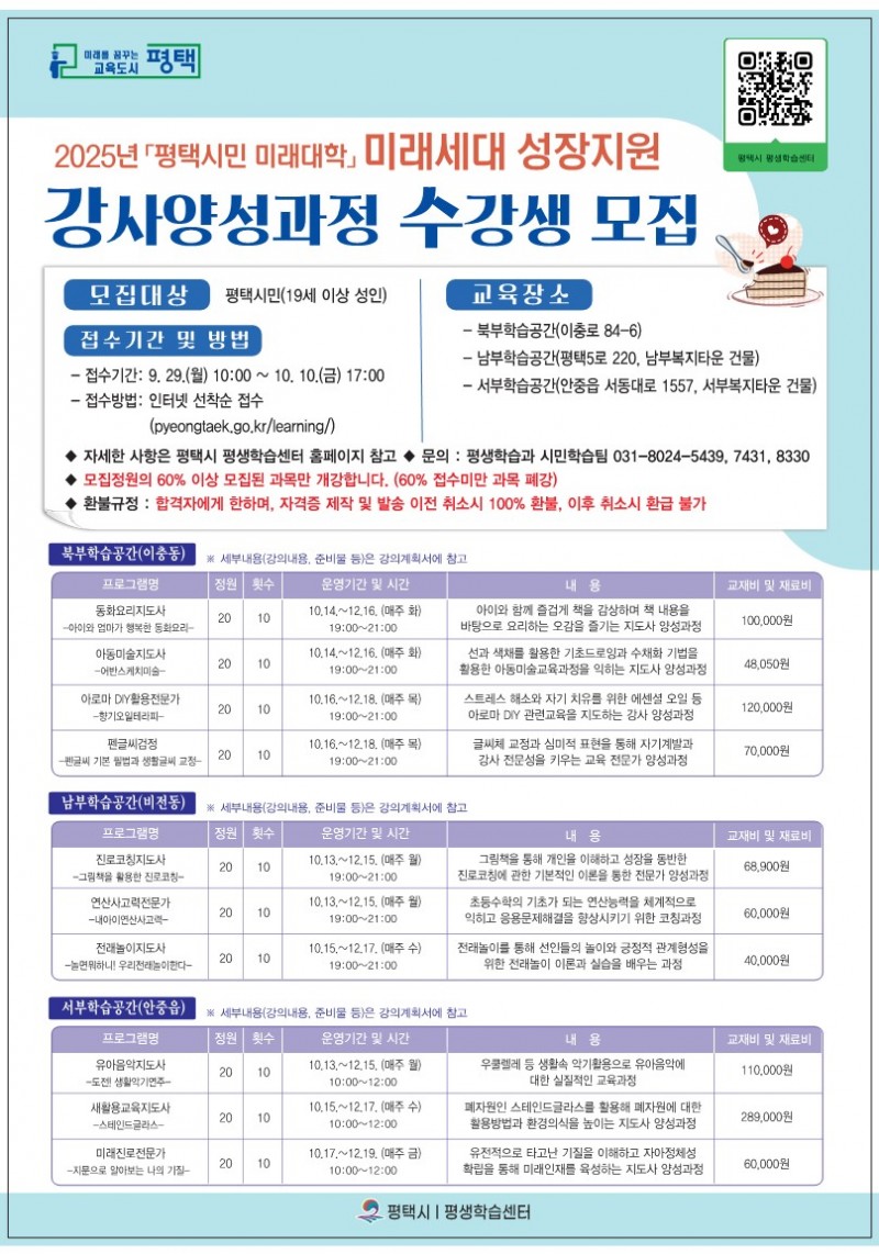 모집 대상은 19세 이상 평택시민이며, 동화요리지도사 등 총 10개 과정에서 200명을 선발한다. 접수는 9월 29일부터 10월 10일까지 평택시 평생학습포털을 통해 온라인으로 진행되며, 교육은 무료이나 교재비와 재료비는 개인이 부담해야 한다.
