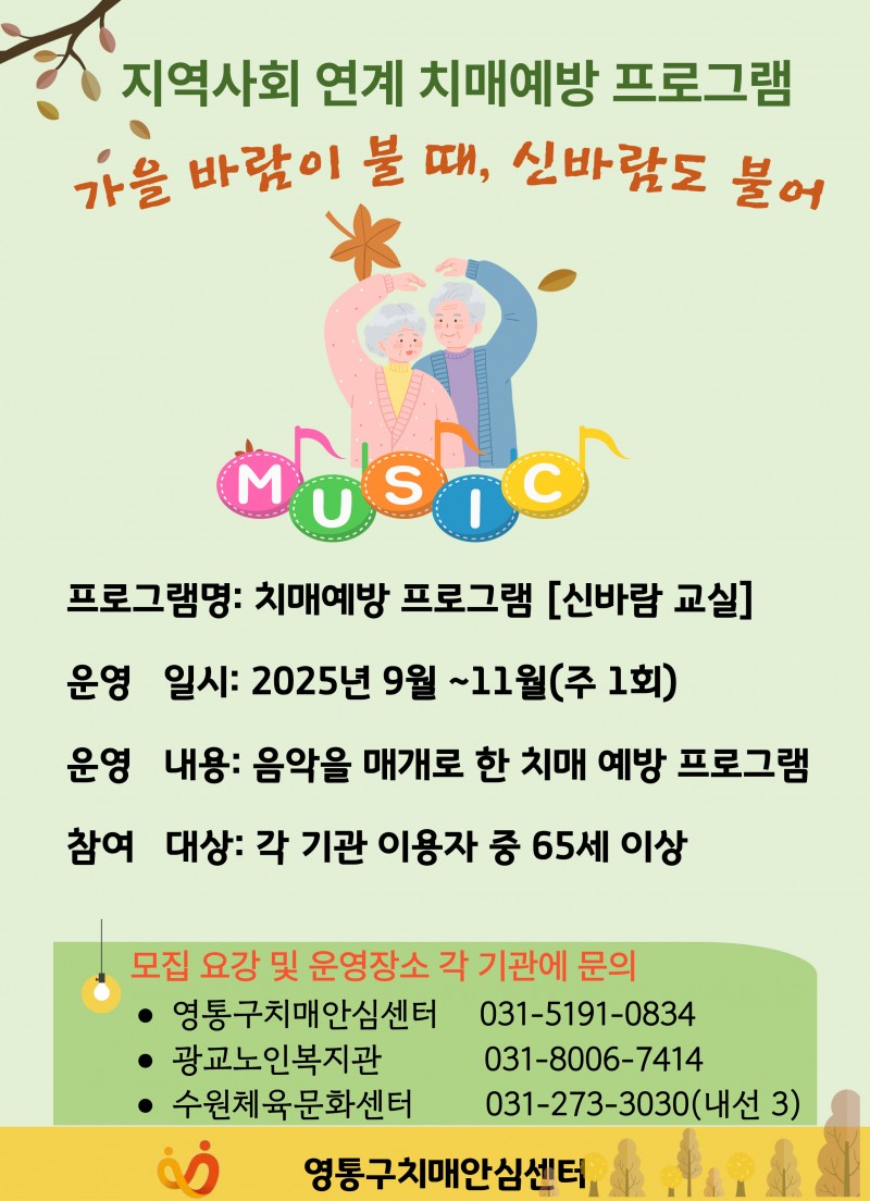 영통구치매안심센터 관계자는 “신바람 교실은 어르신들이 음악으로 자신감을 회복하고 또래와 소통하며 활력을 얻는 계기가 될 것”이라며 “민·관 협력으로 어르신의 참여 기회를 확대하겠다”고 말했다. 이어 “지역사회 통합과 사회적 가치를 실현하는 다양한 활동을 이어가겠다”고 덧붙였다.