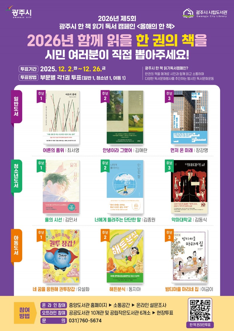 광주시는 ‘2026년 올해의 한 책’ 선정을 위해 시민 투표를 12월 2일부터 26일까지 진행한다고 1일 밝혔다.