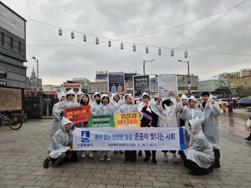 수원특례시(시장 이재준)가 여성폭력 추방 주간(11월 25일~12월 1일)을 맞아 27일 팔달문고객지원센터 앞 광장에서 ‘여성폭력 인식개선 캠페인’을 펼쳤다.