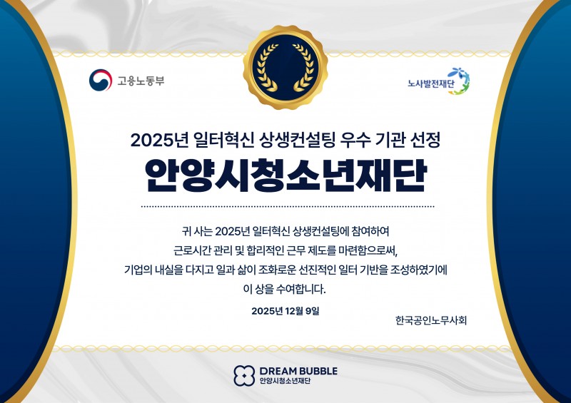 안양시청소년재단(이사장 최대호)은 고용노동부가 주관한 2025년 일터혁신 상생컨설팅에 참여해 근로시간 관리 체계 개선과 합리적 근무제도 마련을 통해 우수 기관으로 선정됐다.
