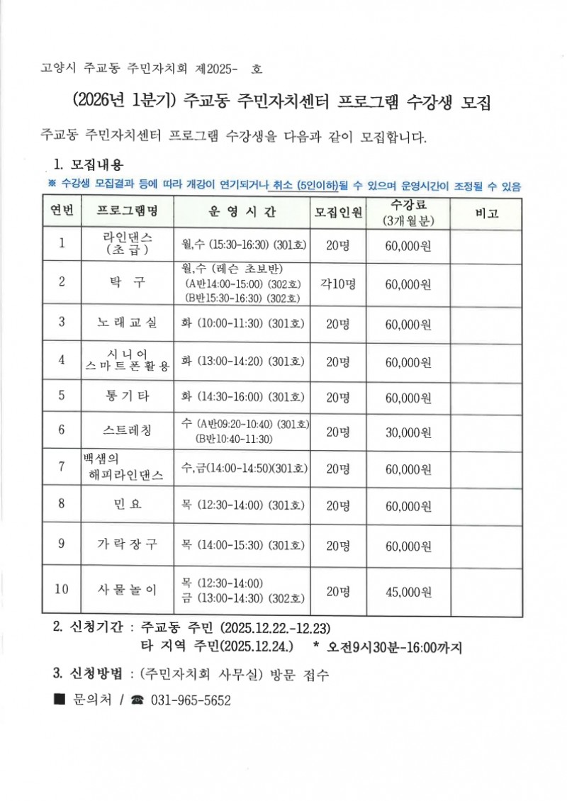 고양특례시 덕양구 주교동 주민자치회는 오는 12월 22일부터 24일까지 2026년 1분기 주민자치센터 문화강좌 프로그램 수강생을 모집한다.
