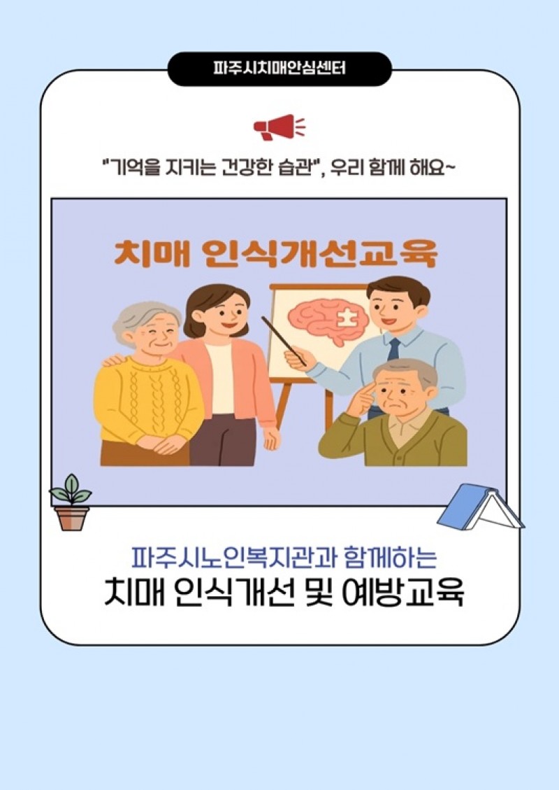 한편, 이번 교육은 파주시치매안심센터와 파주시노인복지관의 협력사업으로 추진되며, 교육 종료 후에는 참여 어르신을 대상으로 치매 조기검진과 예방 상담 서비스도 함께 제공할 계획이다.