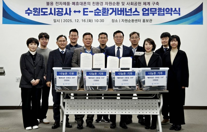 16일 오전 수원도시공사(사장 이영인) 수원시자원순환센터에서 열린 ‘공사·E-순환거버넌스 친환경 자원순환 및 사회 공헌 체계 구축을 위한 협약식’에서 두 기관 관계자가 기념 촬영을 하고 있다. 공사는 협약을 따라 공사 내 불용 전자제품 및 폐휴대폰 재활용 체계 구축, 회수된 폐휴대폰 재활용 사회공헌 기부 프로그램 운영 등을 추진키로 했다. 공사는 이날 폐휴대폰 800개를 모아 E-순환거버넌스에 전달했다.
